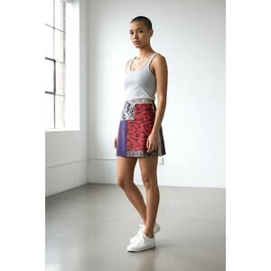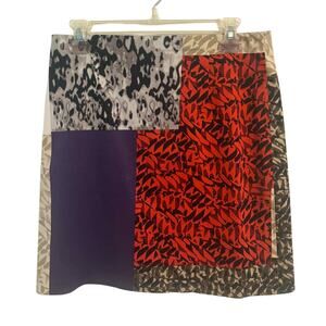 Stand out in this bold and modern Elie Tahari patchwork mini skirt featuring a mix of vibrant animal–inspired prints and saturated color blocking. The smooth, subtly stretchy fabric offers a comfortable fit, and the full lining adds structure and quality. Pair it with a black tank, blouse, or blazer for a striking statement look.