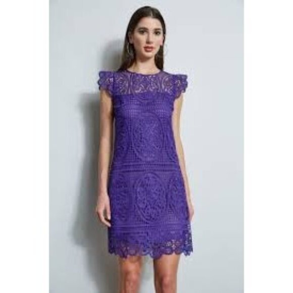 Crafted with intricate lace detailing in a rich plum hue, this sleeveless dress by Elie Tahari embodies refined sophistication. The fit-and-flare silhouette flatters various body types, while the floral patterns exude timeless elegance. Perfect for those seeking a blend of modern and classic style in their wardrobe.