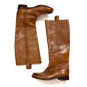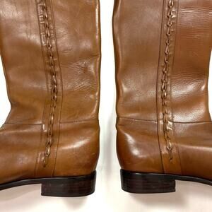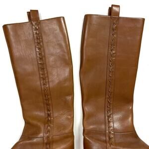 Brown riding boots with woven lace up detail on sides. Pull-on styling.