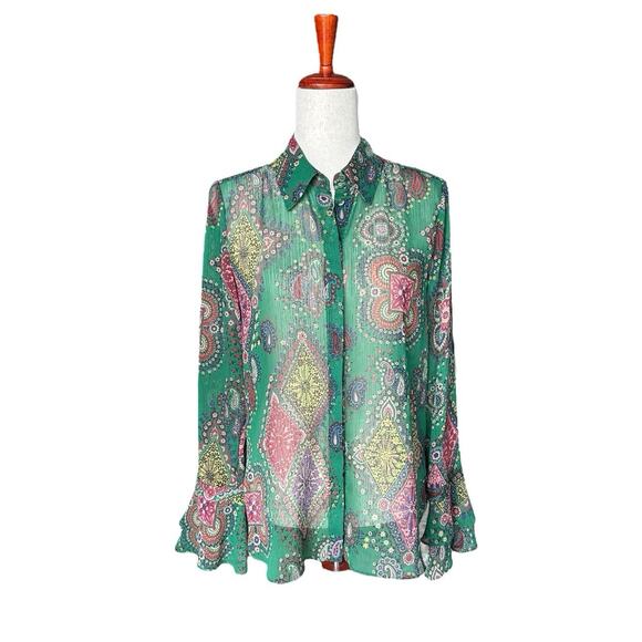 Elie Tahari Sheer Blouse Button Front Bohemian Paisley Print Top Ruffle Cuff L