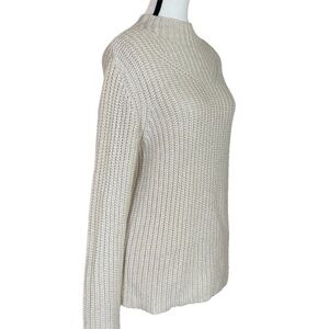 This Elie Tahari mock neck sweater is a chunky ribbed knit with a subtle metallic shimmer throughout the yarn, creating a festive, elegant look. The color is a light beige/cream with gold metallic threads. It has long sleeves and a relaxed, comfortable fit.