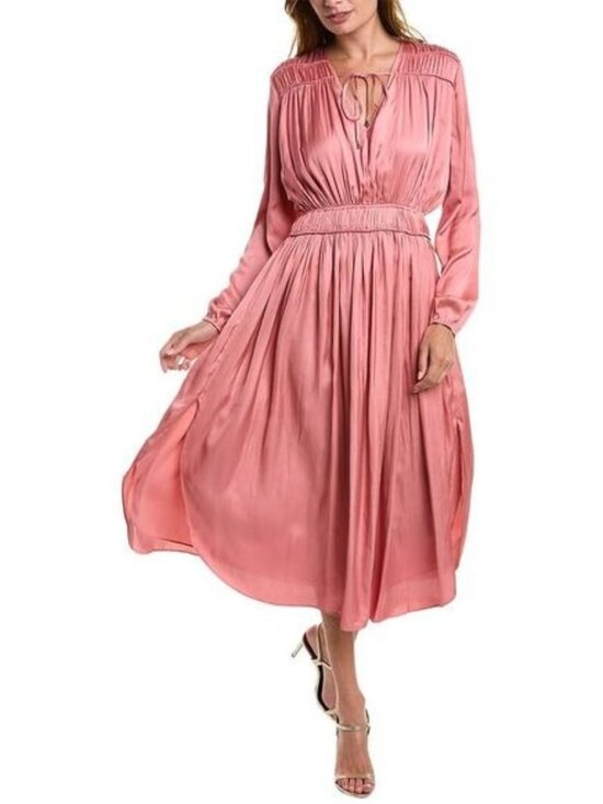 This elegant shirred maxi dress by Elie Tahari features a soft satin finish in a delicate pink hue. The keyhole tie neckline, elastic waist, and curved hem add a refined touch, while the side splits and hidden zip ensure ease of movement and style.
