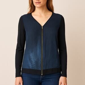 Elie Tahari Silk Front Zip Blouse Women’s Medium Blue Modal Sleeves