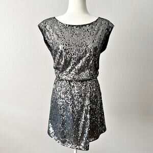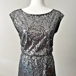 Elie Tahari Silver Sequin Black Mesh Mini Blouson Dress women’s size small