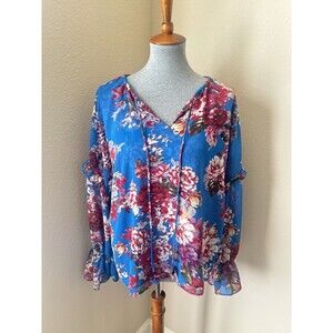 Elie Tahari Size Medium Blue Red Floral Print Ruffle Sleeve Sheer Blouse
