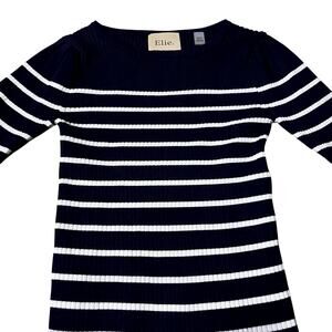 Work, casual wear, layering, all-season style, Elie Tahari sweater, striped pullover, Navy white knit top, viscose nylon sweater, women’s designer sweater, long sleeve top, minimalist sweater, classic stripe sweater, Tahari womenswear, chic knitwear, office casual sweater, Nautical, Cottage, Designer