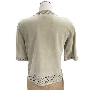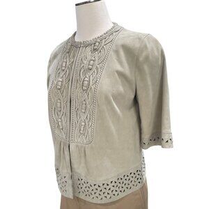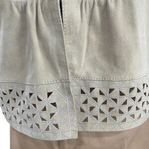 Elie Tahari Suede Embroidered Top Small Laser Cut Boho Western Luxe Beige