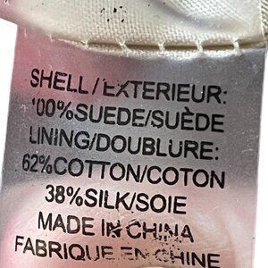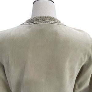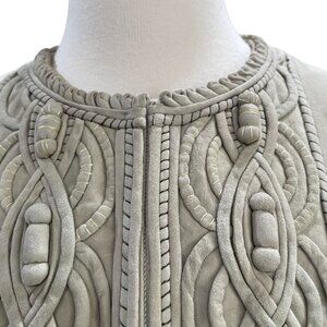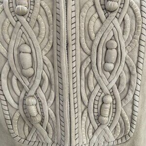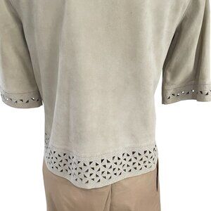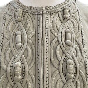 Elevate your wardrobe with this stunning Elie Tahari designer top, expertly crafted from 100% genuine suede in a soft dusty beige tone. This piece is rich in detail and texture, featuring ornate corded embroidery, 3D applique patterns, and geometric laser-cut hems for a luxe, artisan-inspired look.