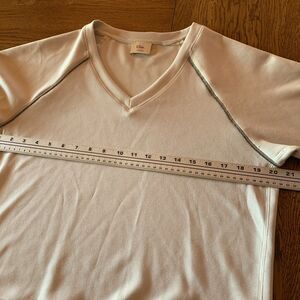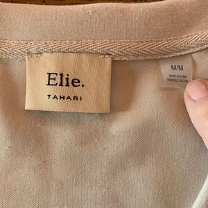 Athleisure at its finest! From designer Elie Tahari. In excellent, preowned condition. No flaws or stains detected. Buttery soft in a cream color with metallic trim. Quiet luxury and minimalist too.