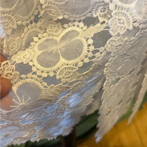 This exquisite white wedding suit by Elie Tahari showcases a delicate lace design with intricate floral and geometric patterns. The fine lacework adds a touch of vintage elegance, making it a perfect choice for a timeless wedding look. This suit exudes sophistication with its subtle sheen and warm white tone.