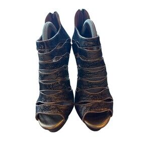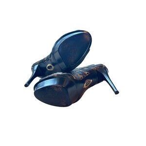 Elie Tahari Women's 38 7.5 Peep Toe Gold Black Lace Zip Pumps Leather 5" Heel. In excellent condition, just a little wear to the bottoms where they contact the ground, the tops are excellent as are the footbeds. Comes with their dustbag, originally a very expensive shoe. Colir is black and gold lace look over leather.