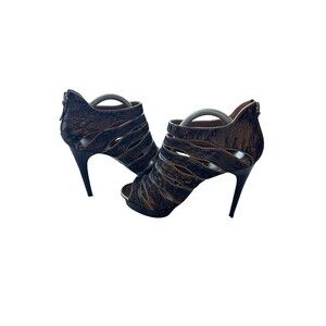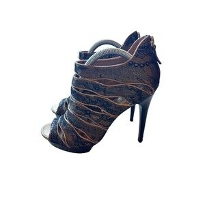 Elie Tahari Women's 38 7.5 Peep Toe Gold Black Lace Zip Pumps Leather 5" Heel