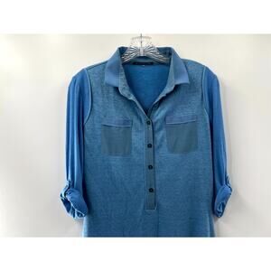 Elietahari Women's Blue Solid Linen Half Button Roll Tab Sleeve Shirt Dress Size XS