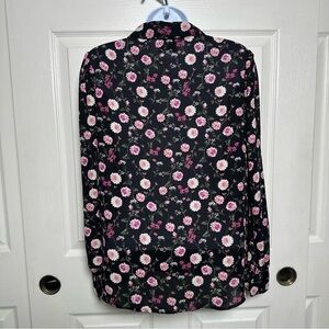 This flowy Elie Tahari women's size small black floral see-through blouse is a stylish and versatile top suitable for various occasions, including workwear, formal events, and casual outings. The blouse features a collared neckline, long sleeves, and fabric-covered buttons for closure. Made from polyester fabric, this lightweight top offers a relaxed fit and is machine washable for easy care. The multicolor floral pattern adds a touch of pretty elegance to this basic yet designer piece, making it a wardrobe staple for any season. Suitable for spring, summer, fall. Elegant and sophisticated office top.