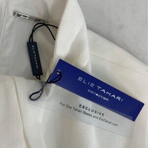 Elie Tahari Women's White Sheath Dress Sz 6 features elegant lace bishop sleeves and a knotted wrapped lapel. This knee-length, long-sleeved, mock neck dress is perfect for semi-formal occasions, combining modesty and femininity. It is brand new with tags. Please refer to the pictures for details. Measurements are shown in the last image.