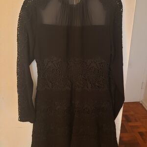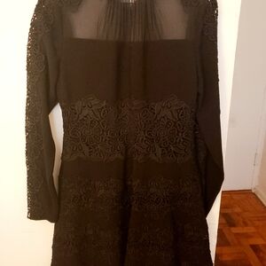 Sz. 4 Gorgeous Elie Tahari lace dress with sheer ruffle top and sleeves. Bodice has lace detailing with v shape zipped back. Never worn, tags removed.