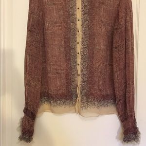 Gauzy silk chiffon blouse. Romantic style with great detailing at cuffs and collar. Beautiful neutral tones that go with everything. Dress it up or go chic casual with jeans and suede ankle boots.