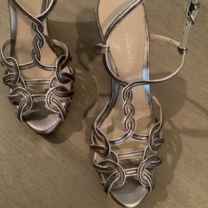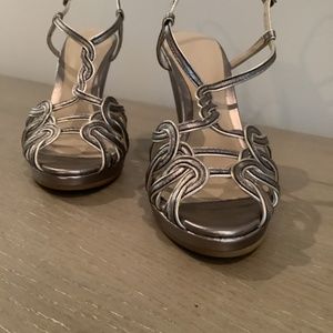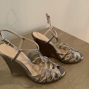Elie Tahari wedge sling back sandal, pewter leather upper and platform heel. — size 37, runs small. Barely worn! 4.5 inch heel and .5 (1/2) inch platform.