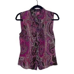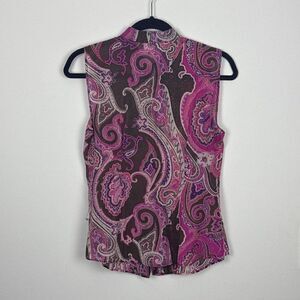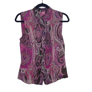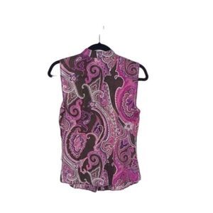 Elie Tahari short sleeve women's silk blouse in rose, tan, dark brown, and cream. Features a closed neck and button-down front with a stylish pleated design. Perfect for a chic and sophisticated look. Size: small.