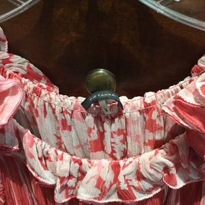 Elite Tahari floral silk skirt and tank set Pretty pinky coral color. Semi sheer Silk chiffon with a pink under skirt/ lining. It has a crinkle texture. The length is just below the knee. The silk skirt is Aline/ trumpet shape and has great movement. It has a delicate hem. Side zipper and hook closures. The waist measures 17.25" across lying flat. The length is 23". The lining skirt is A Line and the fabric has some stretch. The under skirt is silk also! Gently worn, no rips or tears