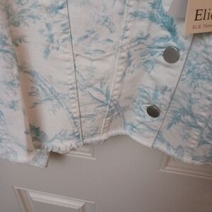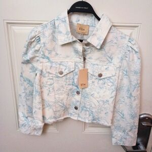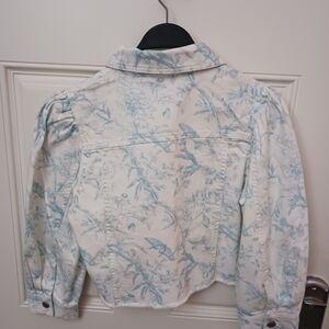 A more feminine take on the denim jacket Pretty Floral w Bird Print Puffed Sleeves Raw Hem Very Slightly Cropped by Elie. Elie Tahari