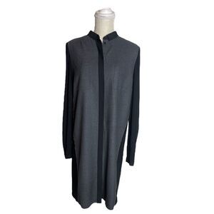 Elie Tahari Valerie Tabbed-Sleeve Wool Shirtdress. Gray, black. Mandarin collar. Hidden button front closure. 3/4 tabbed sleeves. Chest patch pockets. Column silhouette. Yoked back. Center pleat. Adjustable sleeves. Material: 95% wool, 5% elastane for the gray front. Measurements in pictures