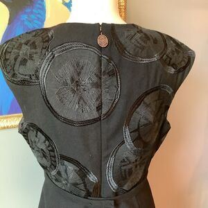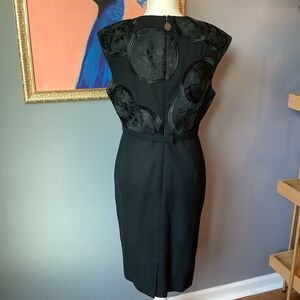 Beautiful black cocktail dress with gorgeous Asian medallion design to bodice. Dress is sleeveless with mini cap shoulders. Snap belt at waist. Zips in back. Fully lined. Extra nice. Wool/elastane. Size 12 Measures are approximate Chest is 18” pit to pit Length is 40”