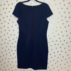 •Features: Navy short-sleeve sheath dress with front silhouette detail. Hidden back zipper.