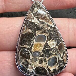 Pendant of a turitella agate stone in an ornate, antique swirl styled 925 silver plated frame.