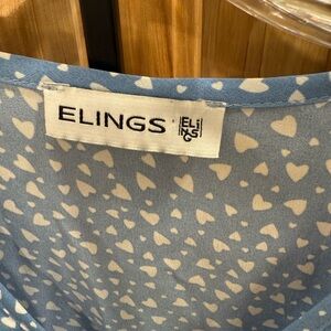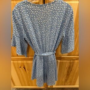 Delightful, sweet blue fabric with white heart designs. Adjustable tie waist with elastic for comfort and fit. Bell short sleeve, v-neck. Size S, excellent condition.