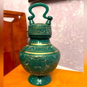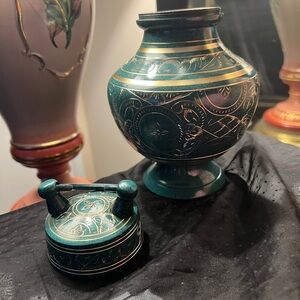 Elinora’s brass and patina, hand carved, polished small pet urn.