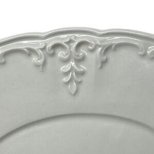 Beautiful Elios Ceramiche ECM3 oval plate, crafted in Italy and featuring elegant all-white embossed scrollwork that gracefully extends beyond its smooth oval edge. Measuring approximately 10" × 7.5", this timeless piece is discontinued and highly sought after by collectors and decor enthusiasts.
