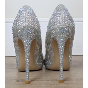 Elisabet Tang size 6 silver rhinestone stiletto pumps with an allover crystal embellished upper. Classic pointed toe silhouette with a stiletto heel fully covered in sparkling iridescent stones. Light pink faux leather style lining and synthetic outsole. Elegant, eye catching pumps ideal for weddings, prom, formal events, pageants, holiday parties, and special occasions.