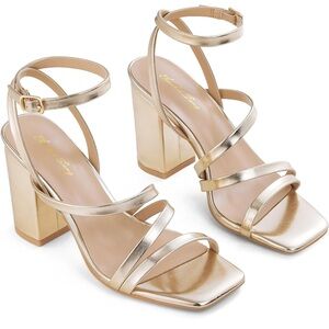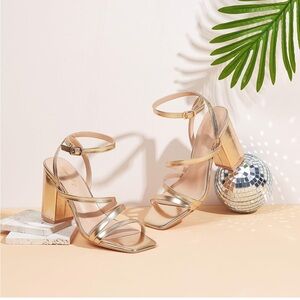 Elisabet Tang Strappy Chunky Gold Square Toe Heels