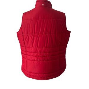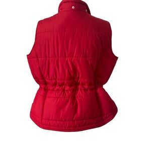 Warm and cozy red puffer jacket with full zipper internal and external pockets, and waist string for flattering look