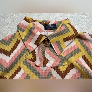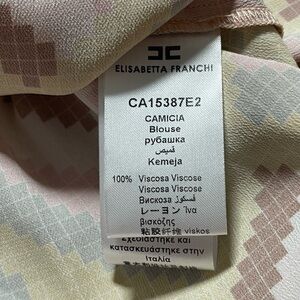 Elisabetta Franchi Camicia Blouse, size 44. Although it has no tags, this Italian-made blouse has never been worn and is in excellent condition. Crafted from 100% viscose, it features a stunning print. This rare piece is incredibly versatile.