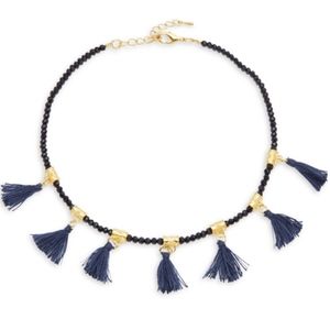 Elise M. Black Glass Gold Bead & Navy Blue Tassel Choker Necklace NWT Adjustable