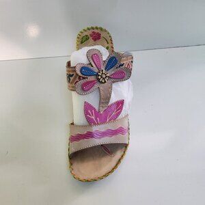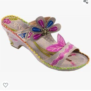 Elite By Corkys NIB Pacific Gray Leather Slip On Mules Sandals Size 11. Stunning Floral Leather Dressing, 2.5" Clog Heel, Bohemian, Coastal, Art To Wear