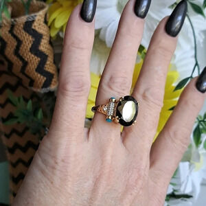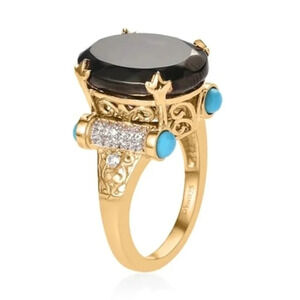 Massive Natural Elite Shungite Center Stone Is Accented With Natural Sleeping Beauty Turquoise & Natural White Zircon. In A Unique Ornately Crafted Ring In An 18k Yellow Gold Vermeil Over 925 Solid Sterling Silver.