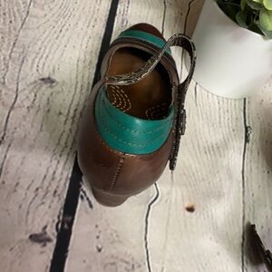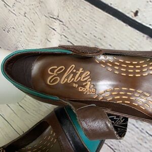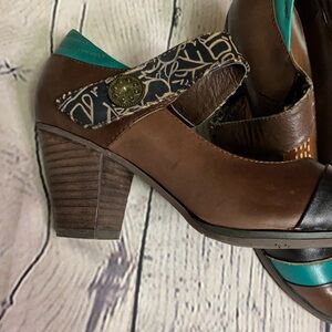 Teal amd black leather stripes over closed toe . Teal one upper back heal . Brown and cream Velcro strap witb a button for design. 2.25 heel