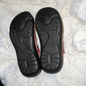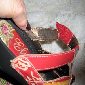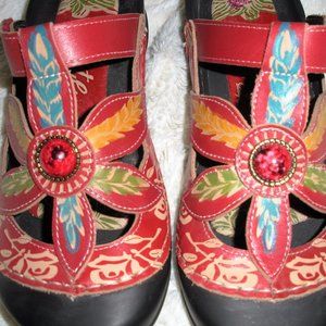 Elite 100% leather upper, synthetic lining in new never worn condition without box. Top cross strap attaches with velcrose. Middle of shoe is detailed wit colorful leather etching and red marbled accent surrounded by silver beads. SIZE is listed on bottom as 37