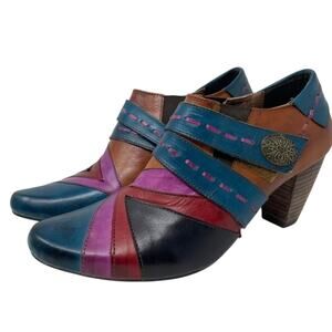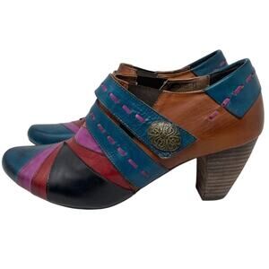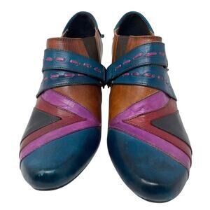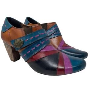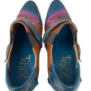 Elite by Corkys Booty Pyramid Collection Sawtooth Ankle Boots. Size 11. Sawtooth, a leather upper in an abstract multicolored design. 3” stacker heel. Cushioned footbed. Adjustable hook and loop strap closure. Great preowned condition.