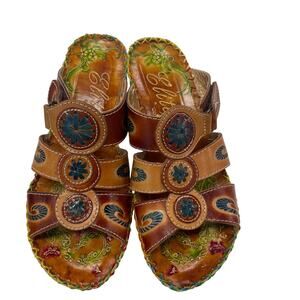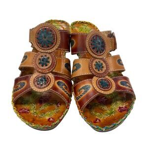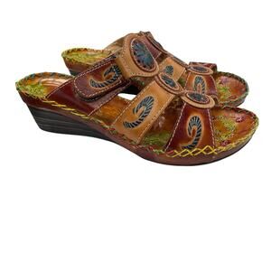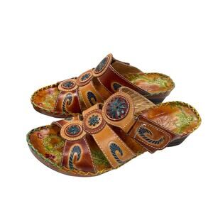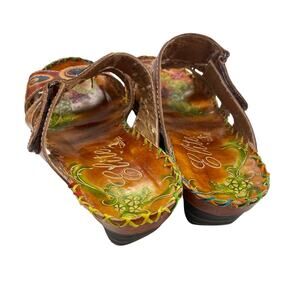 • Features: Easy slip on open toe sandal with wedge heel,, Strappy upper in burnt orange tan color with blue floral detail