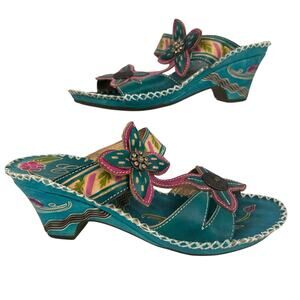 Elite by Corkys Poppy Sandals Womens Size 8 Turquoise Leather Floral Embellished