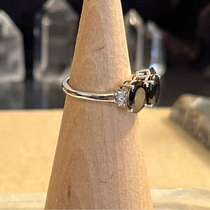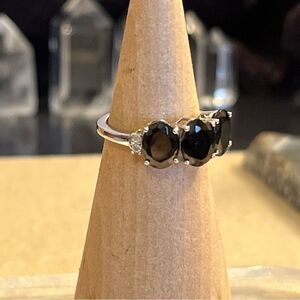 This exquisite DJoy ring features a 3 stunning oval-shaped Elite Shungite stones surrounded by two sparkling Moissanite stones. The gemstones are set in a sleek platinum-plated sterling silver band, with a total carat weight of 1.90. The elite shungite is used as a healing stone, and the ring is available in a size 6. Comes in a beautiful gift box.
