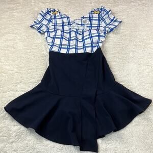 Fitted sheath dress with a bit of stretch. Features white and blue checked lace upper with lightly padded cups, short sleeves, and gold button detail at shoulders. Lower is a pencil fit skirt with asymmetrical ruffled hem. Back zip closure, some stretch to fabric, no pockets. No size tag, but I sized it an xs based on measurements.