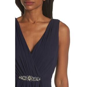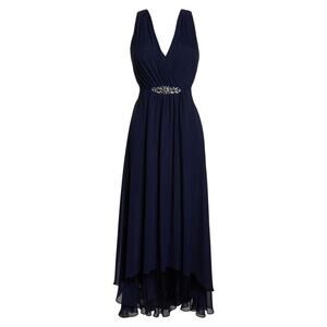 Eliza J Women's Navy Embellished High/Low Chiffon Dress. Cut to flatter and flaunt all of your best features, a gorgeous beaded embellishment at the front waist perfectly punctuates this floaty chiffon gown. Hidden back-zip closure. Surplice V-neck. Sleeveless. V-back. High/low hem. Lined. 100% polyester. Dry clean. Imported
