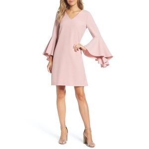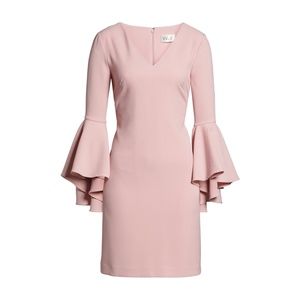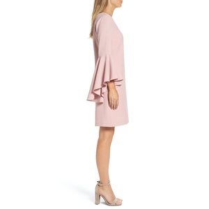 Oversized bell sleeves dramatically punctuate an otherwise simply styled crepe shift dress that makes every occasion a bit more special.