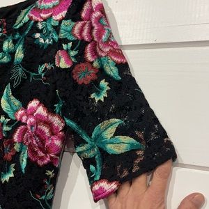 Stunning Eliza J Embroidered Black Dress Accented in a Colorful Floral Embroidery.