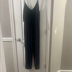 This full-length jumpsuit features a solid black color and a sleeveless design with thin spaghetti straps. It has a deep V-neckline and a relaxed loose-fitting silhouette, making it a comfortable yet stylish choice for any occasion.